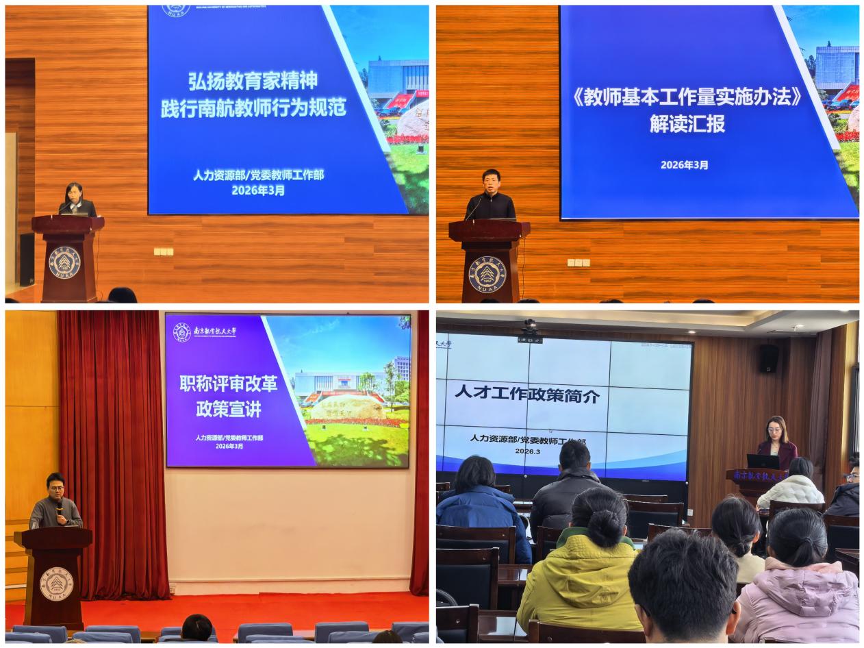 部门各分管负责人分别就师德师风建设、教师基本工作量考核、人才政策和职称评审等重点政策详细宣讲。张晓燕结合学校最新出台的文件,着重解读了《南航教师行为规范》及《进一步压实教职工思想政治和师德师风建设工作主体责任实施办法》,并结合具体案例对文件内容进行细致剖析。黄海鸣对《教师基本工作量实施办法》进行了深入解读,通过详实的案例系统阐释文件出台的背景和核心要义,强调全职全时工作理念和教书育人底线意识。马亚杰围绕职称评审改革政策,从改革背景与流程优化、评审办法修订要点、任职基本标准调整三个方面展开全面解读,详细介绍新政策下评价导向与要求的变化。